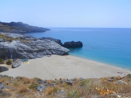 Man muss ein paar Meter die Felsen hinunterklettern um zum One-Rock-Strand zu kommen. Sehr oft sind am Ein-Stein-Strand Gäste der Jugendherberge Plakias. One-Rock ist so etwas wie der Hausstrand der Leute aus dem Hostel, wie die Jugendherberge international heißt, von Plakias. Der Name One-Rock kommt von einem großen Stein in der Mitte des Strands im Wasser (siehe Bild). Die drei Bilder oben sind alle im April entstanden, also außerhalb der Hauptsaison. So leer sind die Strände um Plakias im Sommer natürlich nicht. Anfahrt Damnoni Von Plakias nimmt man die Straße nach Lefkogia. Dies ist die Hauptstraße zur Kreisstadt Rethymno. Nach etwa 2,5 km kommt eine Abzweigung nach rechts, die mit Damnoni ausgeschildert ist. 500 Meter weiter ist man am Ufer. Parken kann man direkt hinter dem Strand, was außerhalb der absoluten Hauptsaison fast nie ein Problem darstellt. Von Plakias geht man nach Damnoni in rund 50 Minuten zu Fuß. Es gibt einen schöneren Weg als auf der Straße auf Feldwegen durch Wiesen usw. Dieser Fußweg ist nicht ganz einfach zu finden. Wenn ihr in die Jugendherberge in Plakias kommt, erklären wir euch gerne den Weg. Ich bin dort meistens am Vormittag (nach Jorgy fragen). Theoretisch kann man nach Damnoni auch mit dem Bus fahren. Alle Busse zwischen Plakias und Rethimno sowie die öffentlichen Kleinbusse zwischen Plakias und dem berühmten Palmenstrand Preveli halten an der Hauptstraße etwa 400 Meter hinter dem Strand. Von Plakias und Rethimno gibt es im Sommer etwa 5 Verbindungen pro Tag nach Damnoni, etwa 4 Busse pro Tag fahren nach Preveli. An der Abzweigung an der Hauptstraße ist Damnoni ausgeschildert. Man findet dort auch eine einfache Bushaltestelle. Ist man in einer Gruppe von 3 oder 4 Personen kann man genauso gut von Plakias mit dem Taxi fahren. Eine Taxifahrt Plakias-Damnoni kostet etwa 7 Euro, der Bus 2 Euro pro Person. In Plakias gibt es einen Taxistand direkt in Zentrum in der Bushaltestelle, in Damnoni muss man ein Taxi bestellen. Wer sich nicht auskennt, kann in einer der Tavernen ein Taxi bestellen lassen. Ein weiterer schöner Strand in der Gegend ist Skinaria. Umgebung von Damnoni