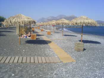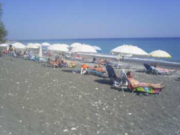 Mirtos: Ein schönes Dorf 16 km westlich von Ierapetra. Hier sind die Urlauber richtig, die Ruhe suchen. Schöne Strände (zum Teil auffallend dunkler Sand) und viele Unterkunftsmöglichkeiten sind vorhanden. Es gibt etwa 6 Busse täglich von und nach Ierapetra (siehe Fahrplan oben). Weiter westlich in Richtung Ano Viannos, Karatokambos, Arvi oder Tsoutsouros kommt man mit dem Bus leider seit einigen Jahren nicht mehr (oder nur 1-2 mal pro Woche). In allen 4 Orten kann man einfache Zimmer mieten. Zwischen Ierapetra und Mirtos liegt das Dorf Gra-Ligia. Dieses Dorf ist auf der hanzen Insel für seine landwirtschaftlichen Produkte, vor allem aus Gewächshäusern, bekannt. Es ist ein wichtiges Anbaugebiet für Frühgemüse für den europäischen Markt. Da die Wintertemperatur hier selten unter 8 Grad fällt, reift hier Gemüse (vor allem Tomaten) früher als in anderen Gegenden Europas. Biegt man nach Gra-Ligia rechts ab, kommt man nach etwa 10 km in das kleine Bergdorf Kalamafka. Sowohl das kaum vom Tourismus berührte Dorf als auch die Berglandschaft in der Umgebung sind sehenswert. Zum Dorf Mirtos findet man in unserem Reiseführer eine eigene Seite. Koutsouras: Eine kleine Stadt etwa 20 km östlich von Ierapetra. Sie ist in den letzten Jahren stark gewachsen, vor allem durch dem Tourismus. Ist man im Frühling hier, sollte man unbedingt das Schmetterlingstal besuchen. Viele Millionen Schmetterlinge sind dort zu dieser Zeit zu bewundern. Koutsouras liegt an der Straße von Ierapetra nach Sitia und ist somit mit dem öffentlichen Bus zu erreichen. Nicht weit entfernt befindet sich die kleine Ortschaft Agios Pandeleimonas mit einer berühmten byzantinischen Kirche, eine der ältesten Kirchen Kretas. Ierapetra Crete: The article in anglish Weitere Informationen auf dieser Webseite suchen: