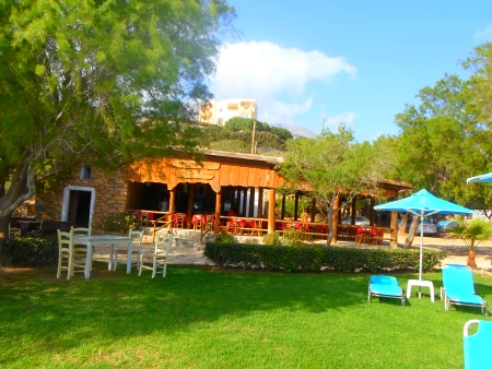 Im Pavlos kann man nicht nur das Panorama genießen, sondern auch gut essen. Die Tomaten-Taler, die Spinat-Taler und die Käsetaschen sind vortreffliche Vorspeisen. Unsere beiden Hauptspeisen, Schwertfisch und Lammkotelett, waren ebenfalls köstlich. Auf der westlichen Seite von Triopetra gibt es ebenfalls mindestens zwei Restaurants. Im Girogiali gibt es unserer Meinung nach die besten gegrillten Hähnchen auf Kreta. Allerdings gibt es diese leider nur sonntags. Auch nebenan in der Taverne und Cafe Apothiki speist man gut. Um die Taverne gibt es eine Rasenfläche. Es ist eine grüne Oase in der sonst so vertrockneten Landschaft um Triopetra. Man kann sich mit einem Frape aus dem Apothiki auf eine der Liegestühle im Rasen legen.